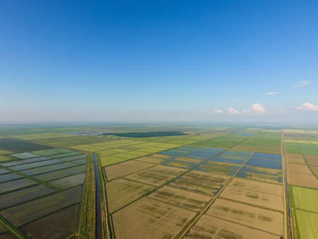 Growing rice on flooded fields. Ripe rice in the field, the beginning of harvesting. A birds-eye view. Flooded rice paddies. Agronomic methods of growing rice in the fields. Flooding the fields with water in which rice sown.