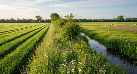 A vibrant rural landscape unfolds with neatly tilled rows of lush green crops stretching across a sun-drenched field. A narrow, clear stream meanders alongside the field, bordered by a profusion of colorful wildflowers including red poppies, blue cornflowers, and white daisies. A dense green hedge and scattered trees form a natural boundary, with a flock of sheep grazing peacefully in a distant pasture under a bright blue sky. The scene evokes a sense of natural beauty and agricultural...