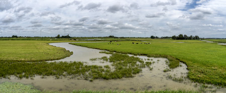 Panorama of farmland at sunset in Ruterpolder near city of IJlst, Friesland, Netherlands