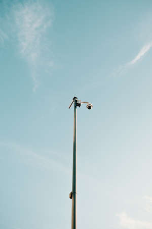 A minimalistic shot of a single vigilance camera in the top of a pole with the clean blue sky as the background
