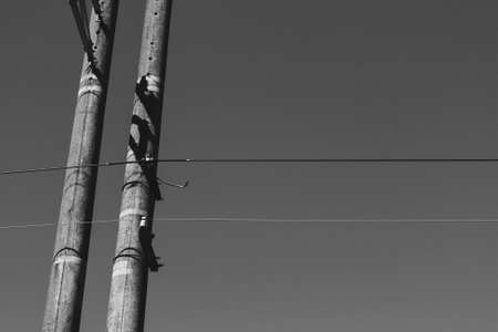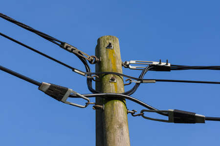 wooden telephone mast with two cables and a safety wire, blue sky