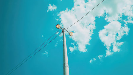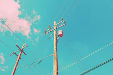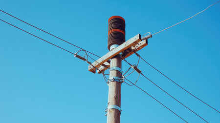This image features an isolated power pole with electric cables against a clear blue sky, showcasing vibrant colors and minimalistic design for artistic purposes.