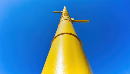 A tall yellow athletic pole rises against a bright blue sky, highlighting its sleek design.