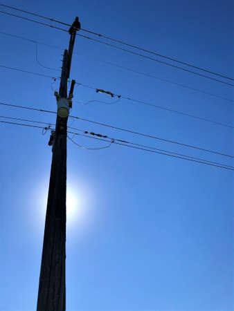 An old electricity pole with several power lines against a bright blue sky