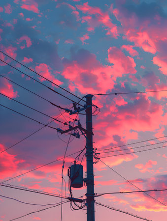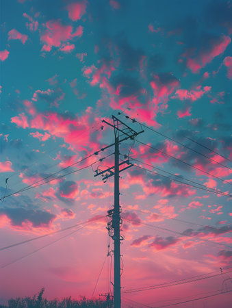 electric pole with twilight pink and blue sky and clouds