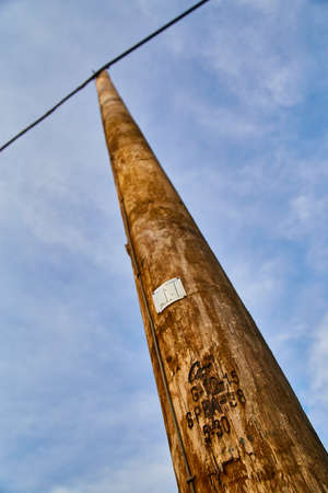 Faded brown telephone pole stretching up to a blue sky