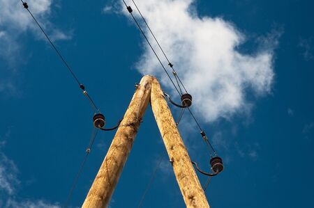 Old wooden electricity poles with metal wires against the sky. Up view.