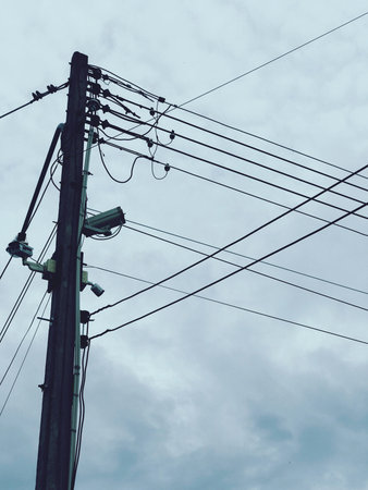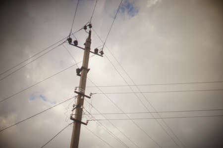 Stone pillar with many wires in cloudy sky background