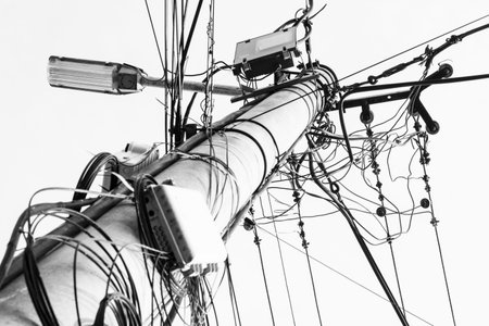 Street electric pole with many electrical wires and fiber optic cables