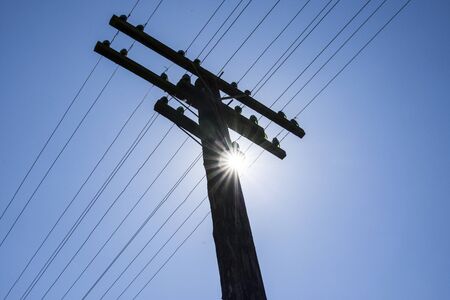 powerline pole against sunshine and blue sky