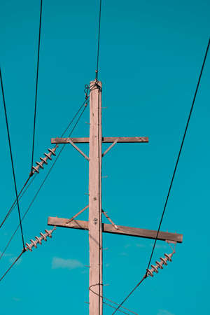 Wooden electricity pole with multiple power lines and glass insulators, set against a clear, vibrant blue sky. Selective focus.