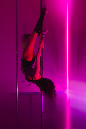 A beautiful girl in neon red light hangs upside down from a pole in a dancesport gym. Motion blur effect for dynamic effect.