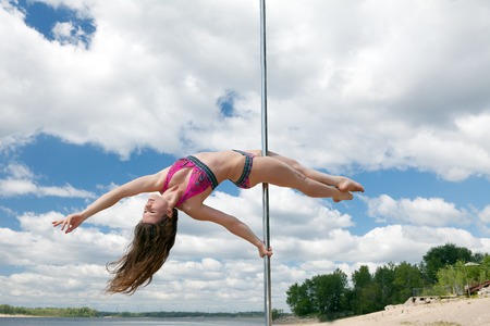 dancer performs akrabotichesky sketch on pole for dancing background of blue sky