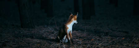 Red fox in the forest. Beautiful fox in the dark forest.