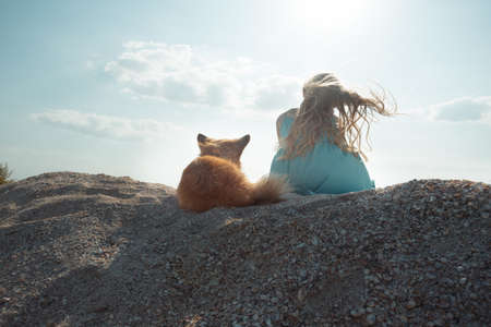 Tame, red fox eats from his hands.animal feeding