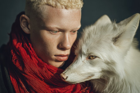 A young man with a vibrant red scarf gazes thoughtfully beside a pristine white fox, creating an intimate, nature-inspired portrait with warm, subtle