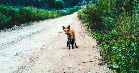 A red fox walks along a dirt road in the summer in the forest.