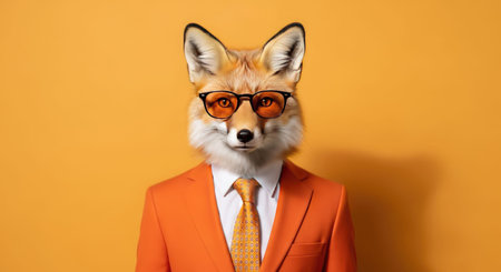 Funny fox in orange suit with glasses and tie on yellow background