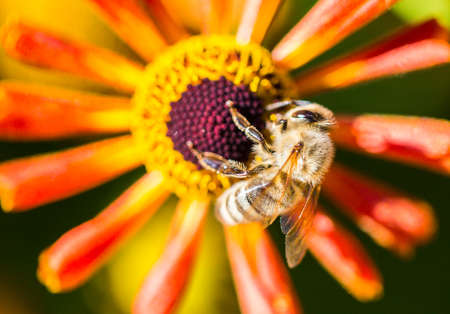 daylight. bee closeup on dandelion. have toning. shallow depth of cut.
