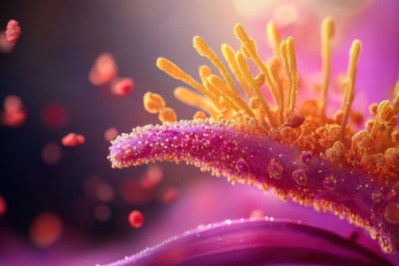 Close up view of pollen grains resting on the delicate stamen of a flower highlighting vivid colors and fine details. The intricacies of nature are beautifully showcased in this macro shot.