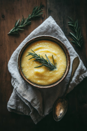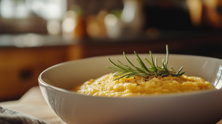 Indulge in a close-up of creamy polenta garnished with fresh rosemary, showcasing its rich texture and inviting colors that enhance any dish.