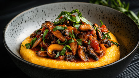 A warm bowl of creamy polenta topped with sauted mushrooms and fresh herbs, showcasing its smooth texture and rich flavor, perfect for a comforting meal.