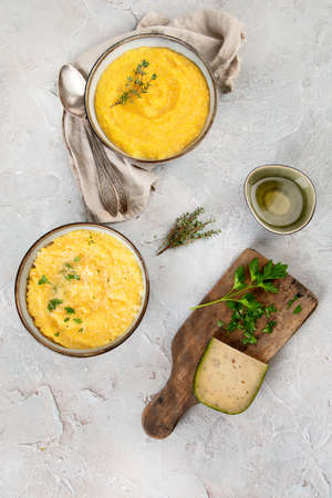 Corn polenta on gray background. Healthy food concept. Top view, flat lay, copy space