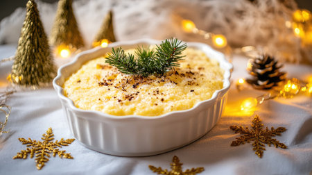 A creamy and inviting dish presented in a white bowl, beautifully garnished with pine and surrounded by festive decorations and soft lighting.
