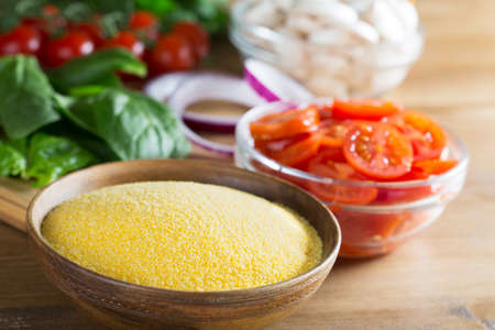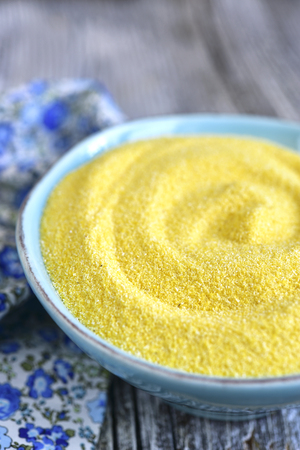 Corn grits polenta in a wooden bowl. Corn groats close up