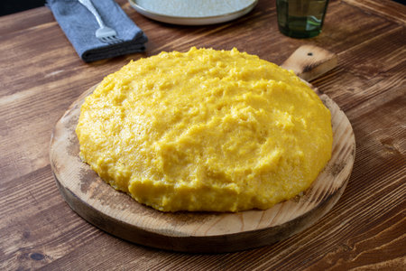Corn polenta slices with grinded corn on wooden board. Homemade palenta, healthy vegetarian food.