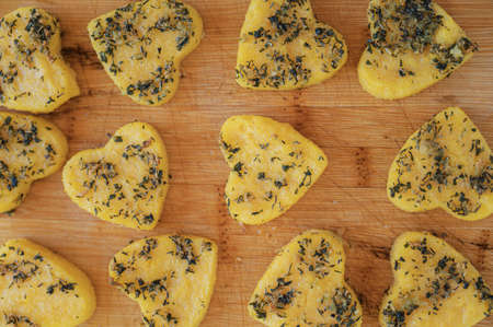 Top view of polenta with herbs cut in heart shape placed on wooden board.
