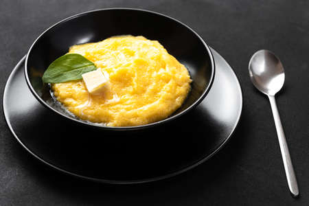 Corn porridge polenta on a dark background in a black plate with a piece of butter