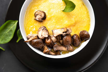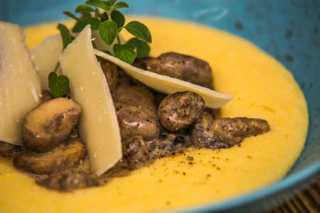 A closeup shot of cooking polenta. Polenta is a traditional Northern Italian dish made from coarse corn flour. A classic side dish of corn porridge polenta with mushrooms
