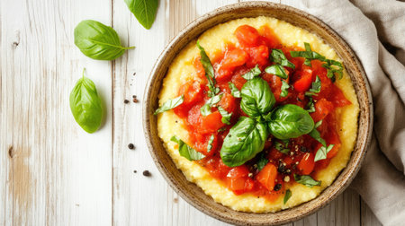 A bowl of creamy polenta topped with vibrant tomato and fresh basil. This delicious dish is perfect for a healthy meal or as a comforting side.