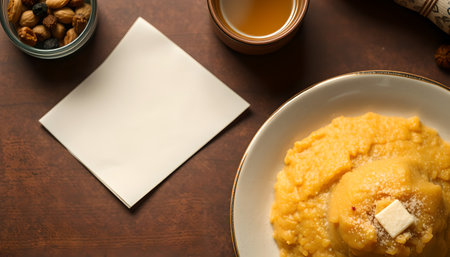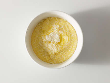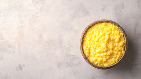 A rustic bowl filled with creamy yellow polenta sits against a soft neutral background. Perfect for showcasing comfort food or healthy meal ideas.