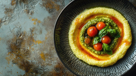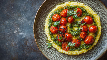 This elegant dish features creamy polenta topped with vibrant pesto and fresh tomatoes. A delicious and artistic portrayal of gourmet cuisine.