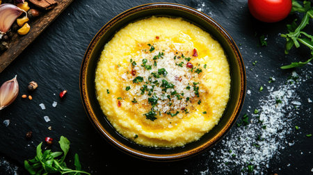 A top view bowl of creamy polenta garnished with chopped ingredients, showcasing vibrant colors and textures, perfect for food photography and culinary art.