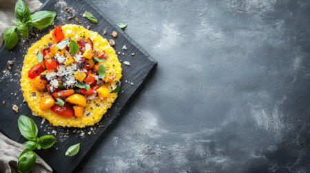 This delightful corn polenta dish features a colorful vegetable topping, garnished with fresh herbs, perfect for a gourmet meal or special occasion.