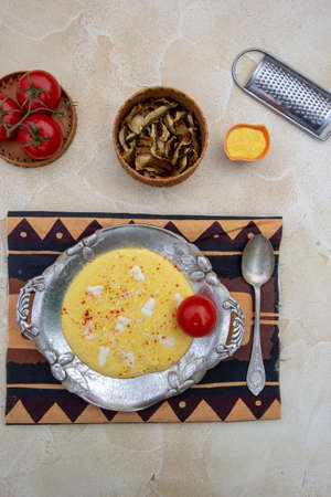 banosh, a traditional Ukrainian corn grain dish with fat and sheep cheese. style rustic. selective focus.