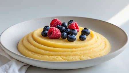 AI Generated. Delicious Creamy Polenta with Fresh Raspberries and Blueberries