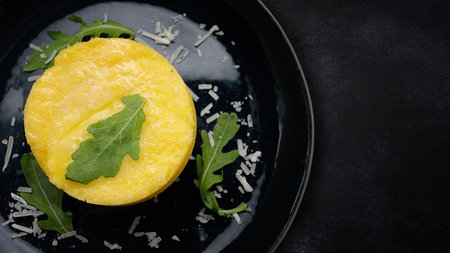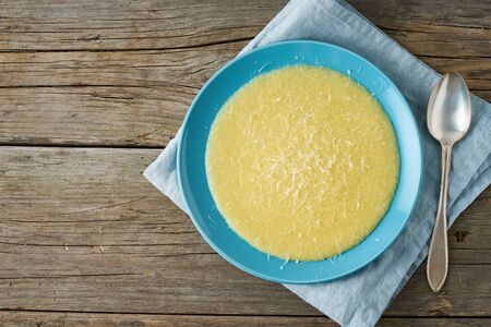 Polenta, porridge with Parmesan cheese on the old dark wooden background, copy space, top view, traditional Italian cuisine