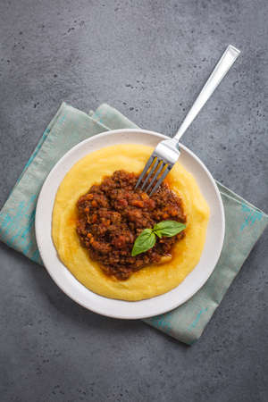 Polenta (boiled cornmeal) with meat-based sauce - ragù alla bolognese. Grey background.