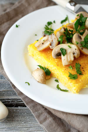 Corn polenta slices on wooden board. Homemade palenta, healthy vegetarian food.