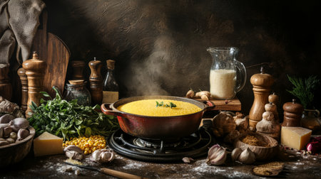 A rustic Italian kitchen scene with a pot of polenta bubbling on the stove, surrounded by fresh ingredients like cornmeal, herbs, and cheese, capturing the essence of homemade cooking.