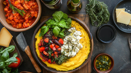 A vibrant overhead shot of a polenta board with different toppings, including cheese, vegetables, and sauces, inviting viewers to explore the diverse flavors.