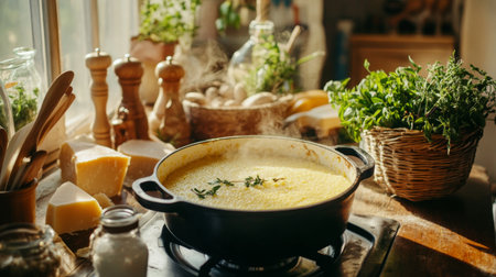 A cozy kitchen scene featuring a freshly cooked dish in a pot, surrounded by herbs, cheese, and wooden utensils, creating a warm and inviting atmosphere.