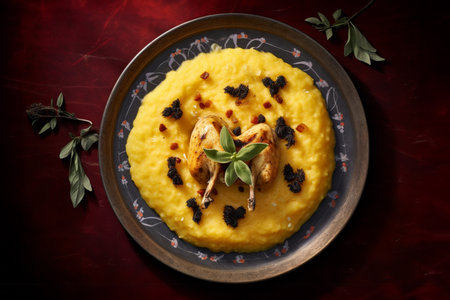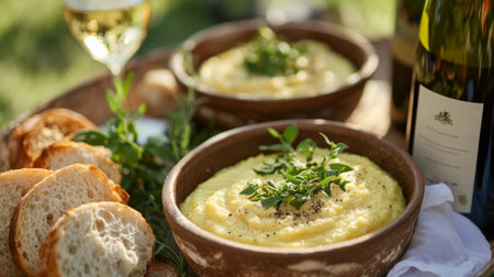 Indulge in creamy polenta served with fresh herbs, paired with a glass of wine. A perfect rustic meal for outdoor gatherings or intimate dinners.