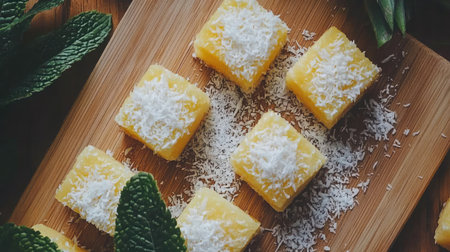 Enjoy this vibrant display of coconut and pineapple treats garnished with shredded coconut. Perfect for dessert lovers seeking tropical flavors.