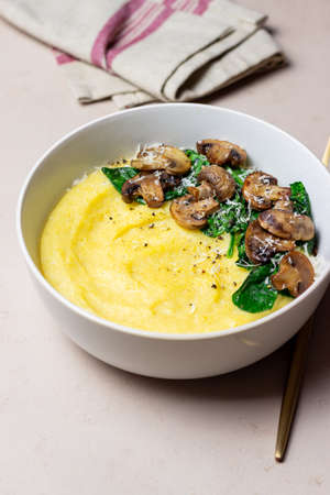 Polenta with mushrooms, spinach and cheese. healthy eating. Vegetarian food. Italian food