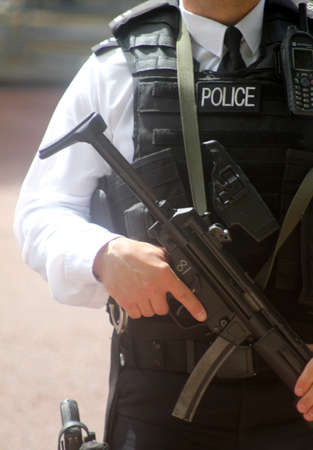 police officer with automatic machine on the law enforcement officer, protection and safety